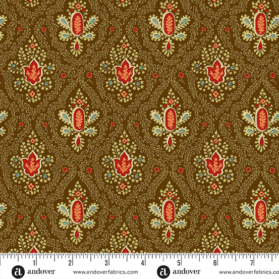 Ce tissu fait parti de la collection "autumn woods" de Renée NANNEMAN. Il reprend par son graphisme une copie d'ancien sur fond brun. Il existe en deux autres versions sur fond vert clair et sur fond écru. Dans cette collection tons lumineux et motifs nous ramènent à l'automne.