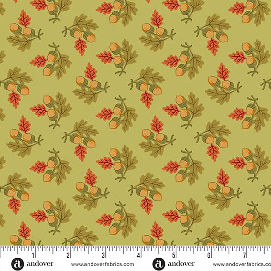 Ce tissu fait parti de la collection "autumns woods" de Renée NANNEMAN. Motifs petits glands et feuilles sur fond vert clair. Cet imprimé existe en deux autres versions sur fond brun et sur fond jaune/ocre. Cette collection représente l'automne par ses tons chauds et ses motifs.