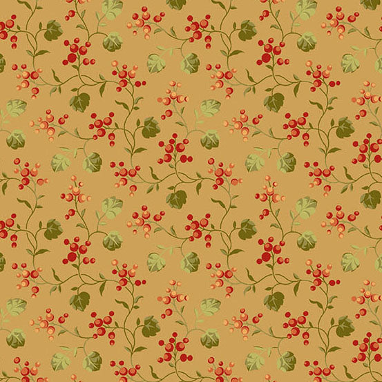 Ce tissu fait parti de la collection "Autumn woods" de Renée NANNEMAN. Collection aux tons chauds et motifs d'automne. Cet imprimé, grappes de groseilles sur fond jaune/ocre existe en deux autres versions sur fond écru et sur fond marron.
